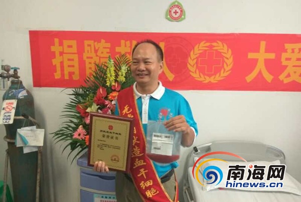 中国造血干细胞库志愿者陈运寰在海口市人民医院捐献造血干细胞。南海网记者马伟元摄 9月26日上午,中国造血干细胞库志愿者陈运寰在海口市人民医院捐献造血干细胞救助河北一白血病患者,成为我国第6770例、海南省第88例造血干细胞捐献志愿者。 陈运寰45岁,是海南东方人,现为海南矿业职工,心地善良的他多次无偿献血,经常参加公益活动。他对造血干细胞早先也有些了解,知道造血干细胞是很神奇的东西,可以挽救白血病人的生命,但因信息不畅,不知怎样才能实现捐献造血干细胞救人。2014年11月,陈运寰响应单位的号召,参加无偿献血,正好有昌江县红十会的工作人员在宣传造血干细胞的知识,招募爱心人士加入中国造血干细胞库,因为加入中国造血干细胞库能创造救人的机会,便毫不犹豫地填了志愿加入造血干细胞库的志愿书,留下了6毫升血样,正式加入了中国造血干细胞库,成为一名造血干细胞捐献志愿,成为志愿者后,陈先生希望有一天能够实现救人的愿望。 陈运寰相信缘份。造血干细胞配型成功的概率非常低,很多的时候是万分之一甚至是上百万分之一,因而要实现捐献造血干细胞救人是一件很不容易的事。陈先生觉得自己很幸运,才入库两年多就与患者配型上了,这是很多志愿者一辈子也等不来的机会。 虽然现在他与患者不曾认识,以后可能也不会见面,但成功挽救了患者的生命后,患者身体里面流的血将与自己的血一模一样,因是自己的造血干细胞经分化再造生成的血液,血浓于水,想着这些,想着世界上有一个人因自己而得救,陈运寰很幸福。能救他的命,这是一种缘份,机会难得,一定要履行入库前许下的救人承诺。 陈运寰家里兄弟姐妹9人,因以前的生活条件不好,家里的负担重,所以吃过很多的苦。苦难中陈运寰也得到过别人的帮助,发自内心深处地感谢他们,在住后的生活里,陈运寰也很愿意帮助别人。 从苦难中走过来的陈运寰,非常坚强,非常但定,不是特别难的事从不轻易开口求助。他想人都是一样的,不是过不去的坎别人是不会轻易发出求助信息的。而今天有患者向中国造血干细胞库申请检索,检索到自己的血液HLA配型与他相合,并发出了求救的请求,性命相托,远非一般情况下发出的帮忙的请求,现在的情况是只有自己一个什么能救他,此时自己没有理由旁观,没有理由推三阻四,救人责无旁贷。 据悉,陈运寰的造血干细胞将救助河北某医院25岁的白血病小伙。